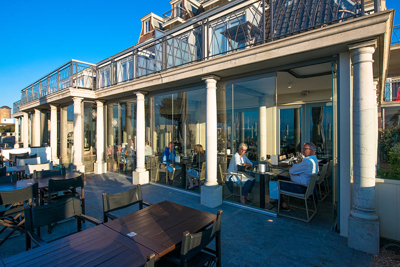 This transparent all-glass horizontal sliding wall system without vertical profiles on the panel edges consists of individual sliding panels which are not connected to each other. This makes it particularly safe to operate and virtually maintenance-free.